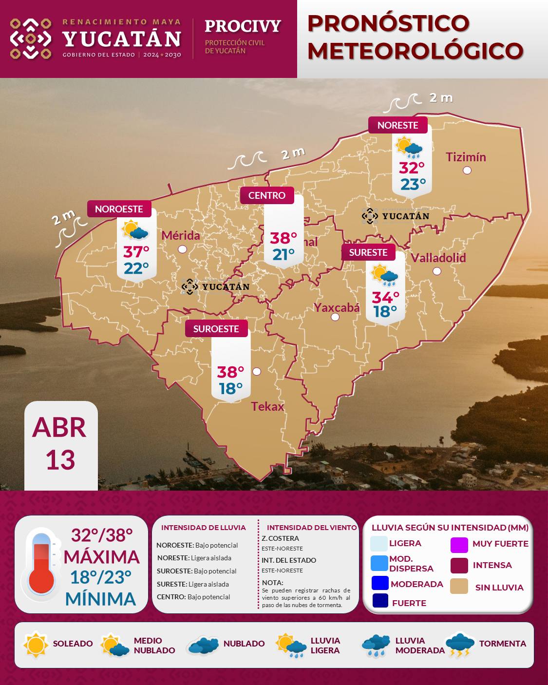 Yucatán tendrá un lunes mayormente estable por la influencia de un sistema de alta presión, aunque con ambiente muy caluroso en gran parte del estado. Las temperaturas alcanzarán entre 32 y 38 grados en el interior.